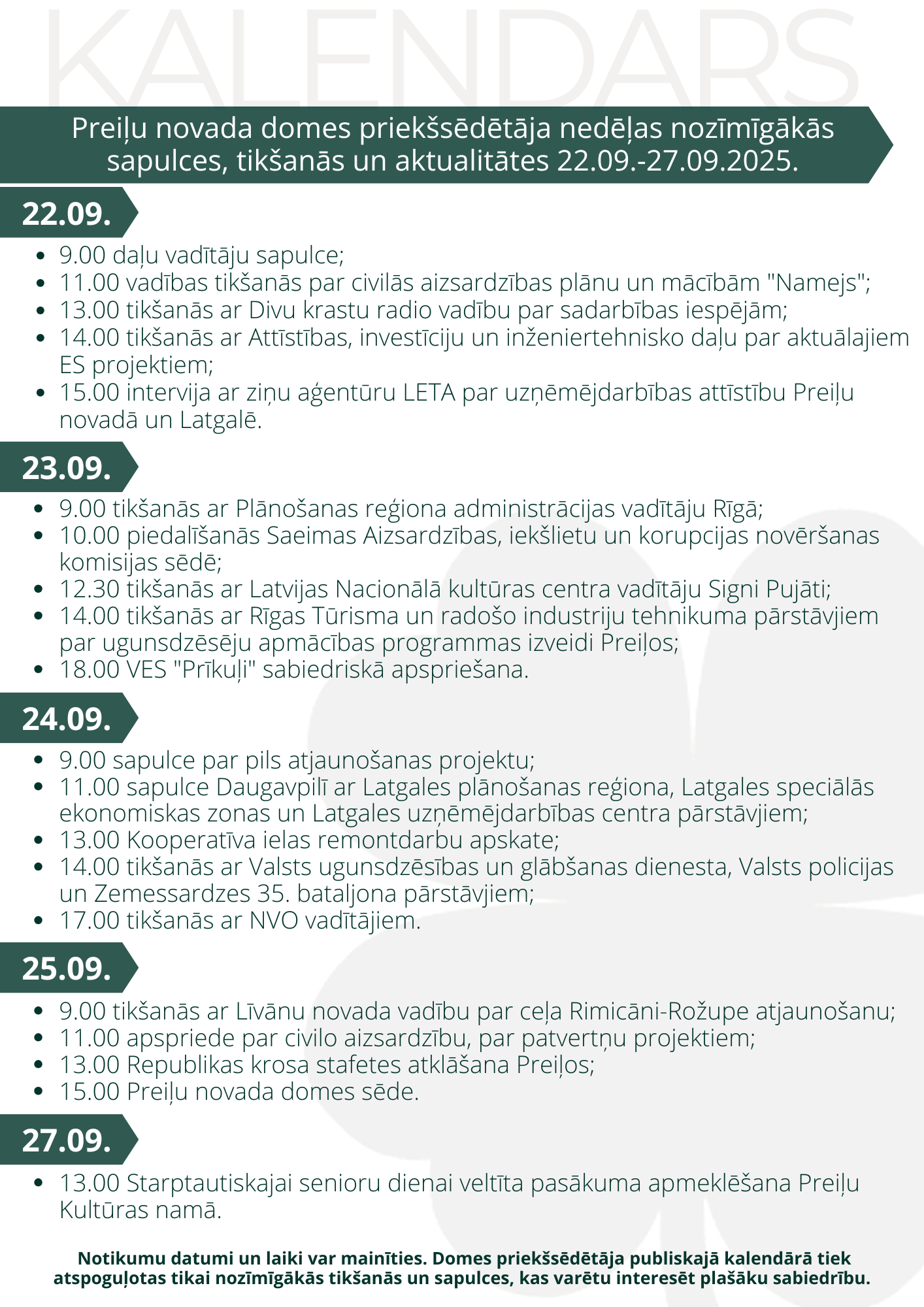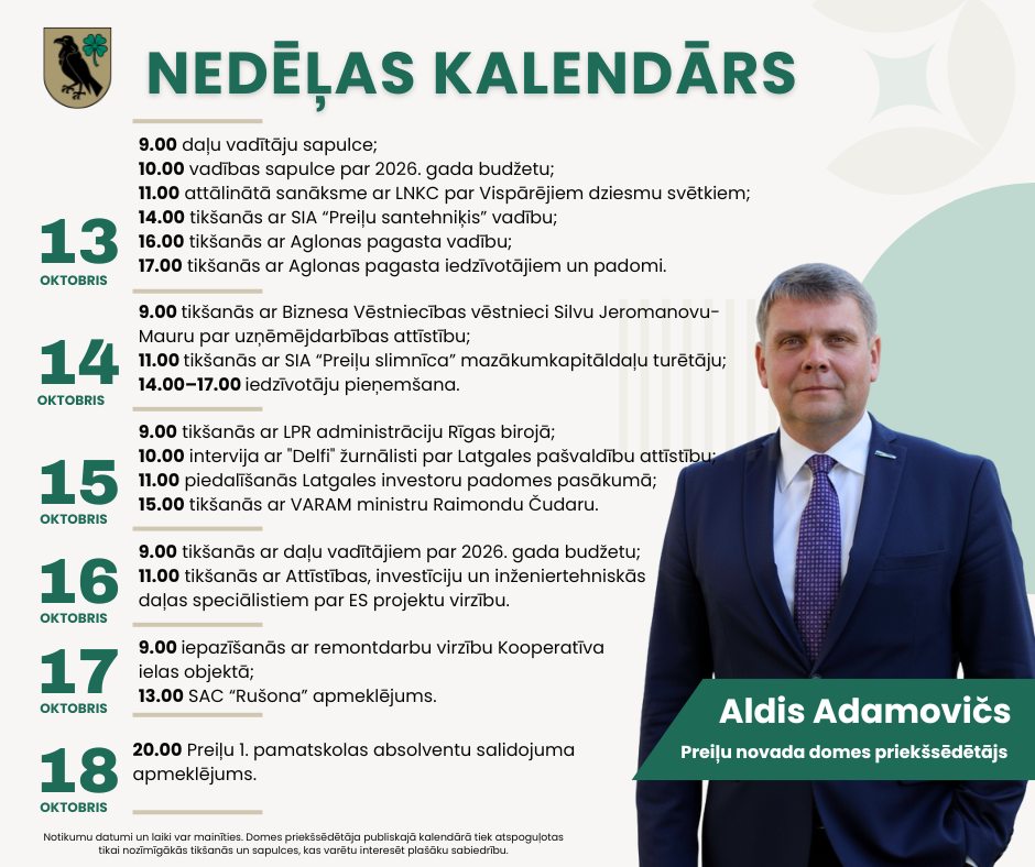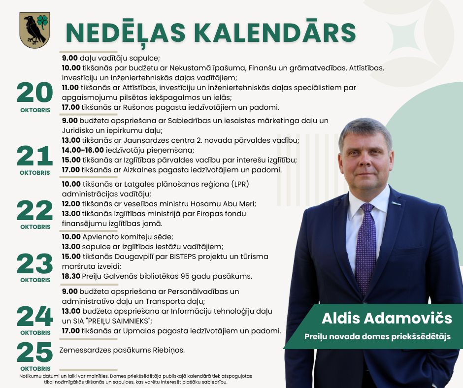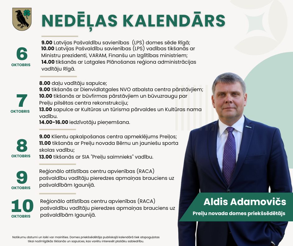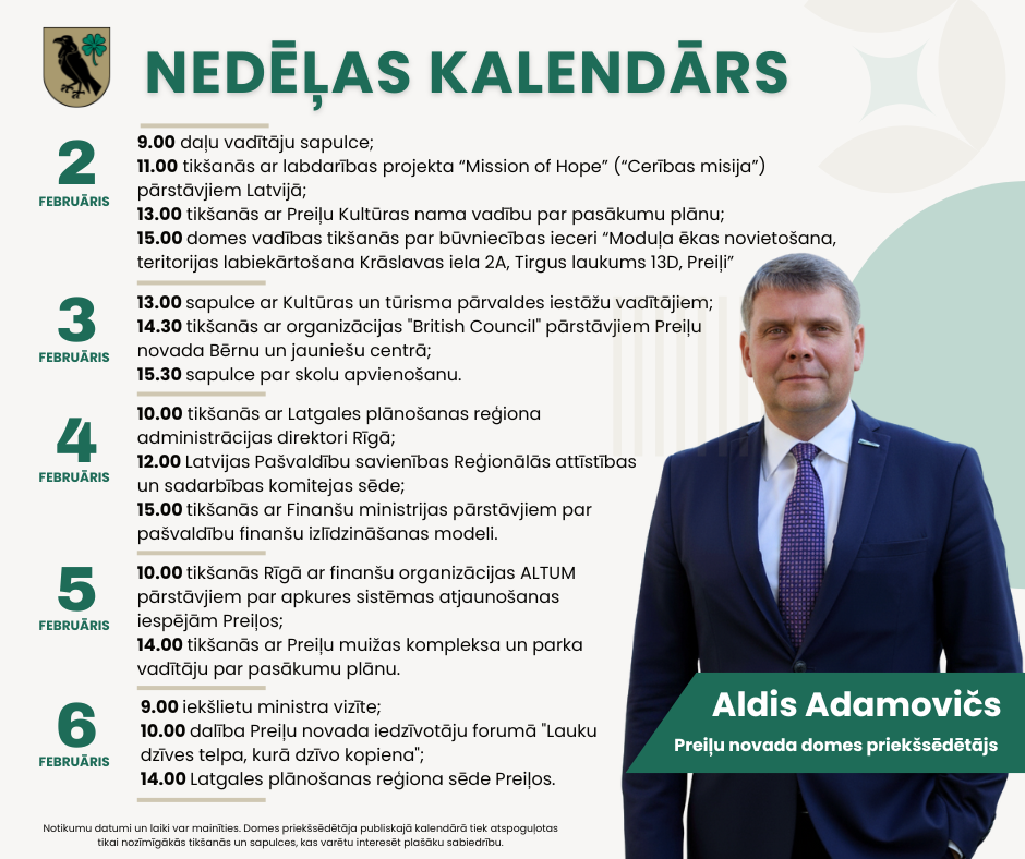 Domes priekšsēdētāja darba kalendārs pa nedēļām: