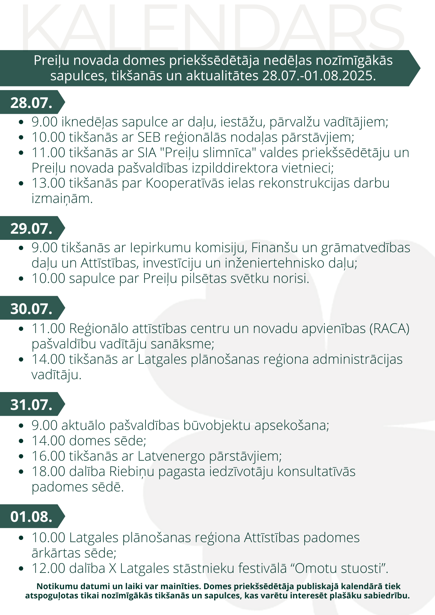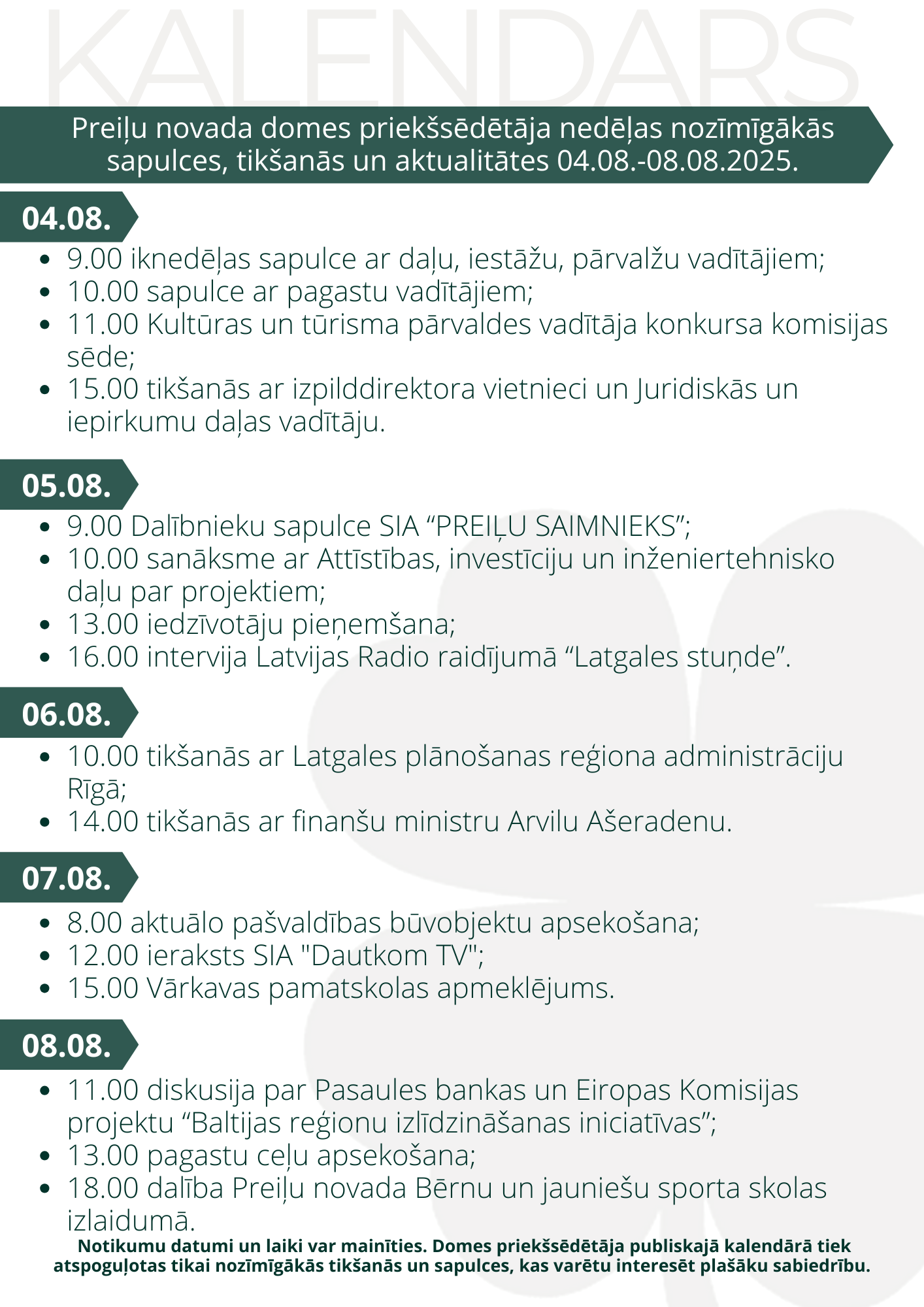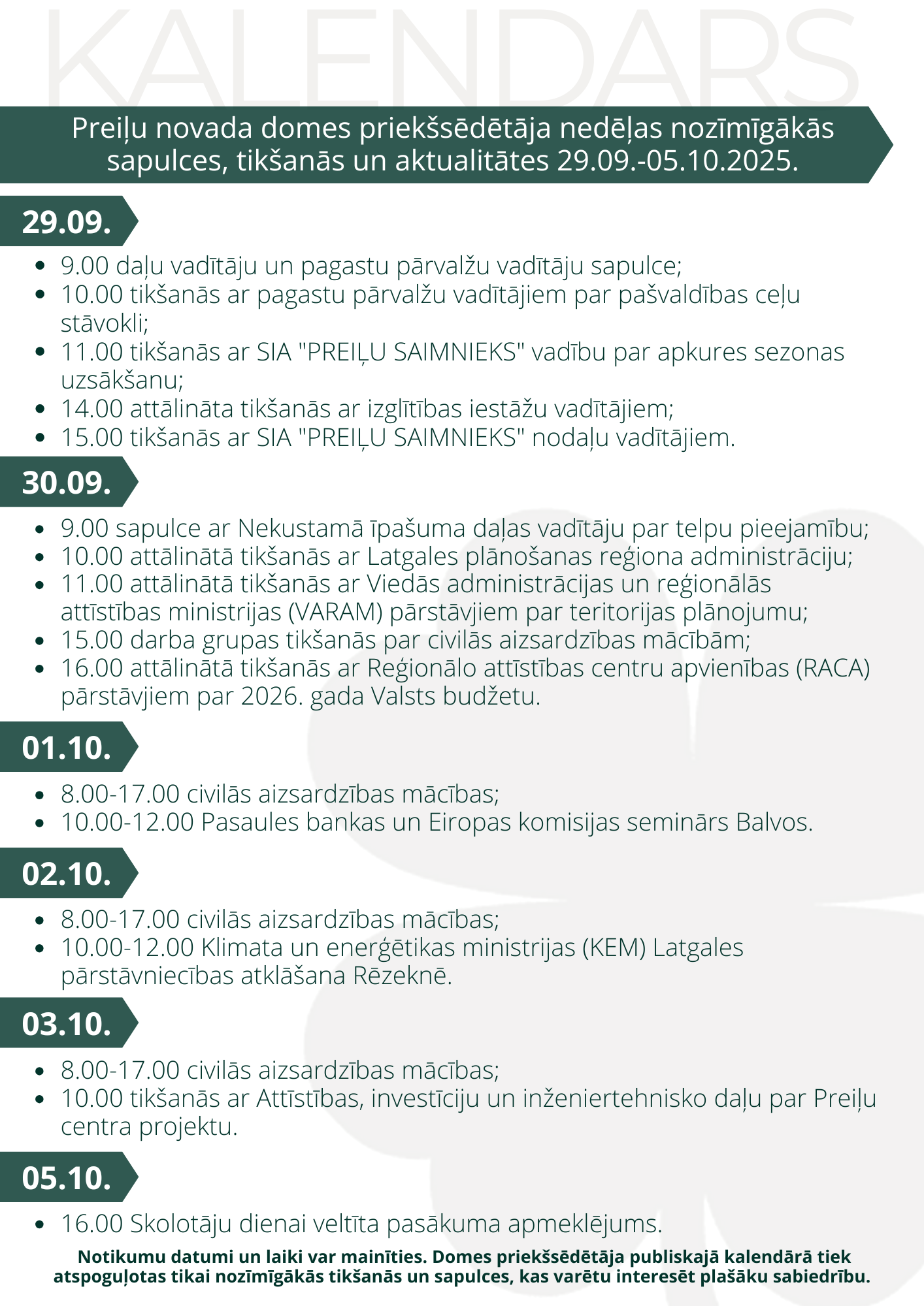 Domes priekšsēdētāja darba kalendārs pa nedēļām: