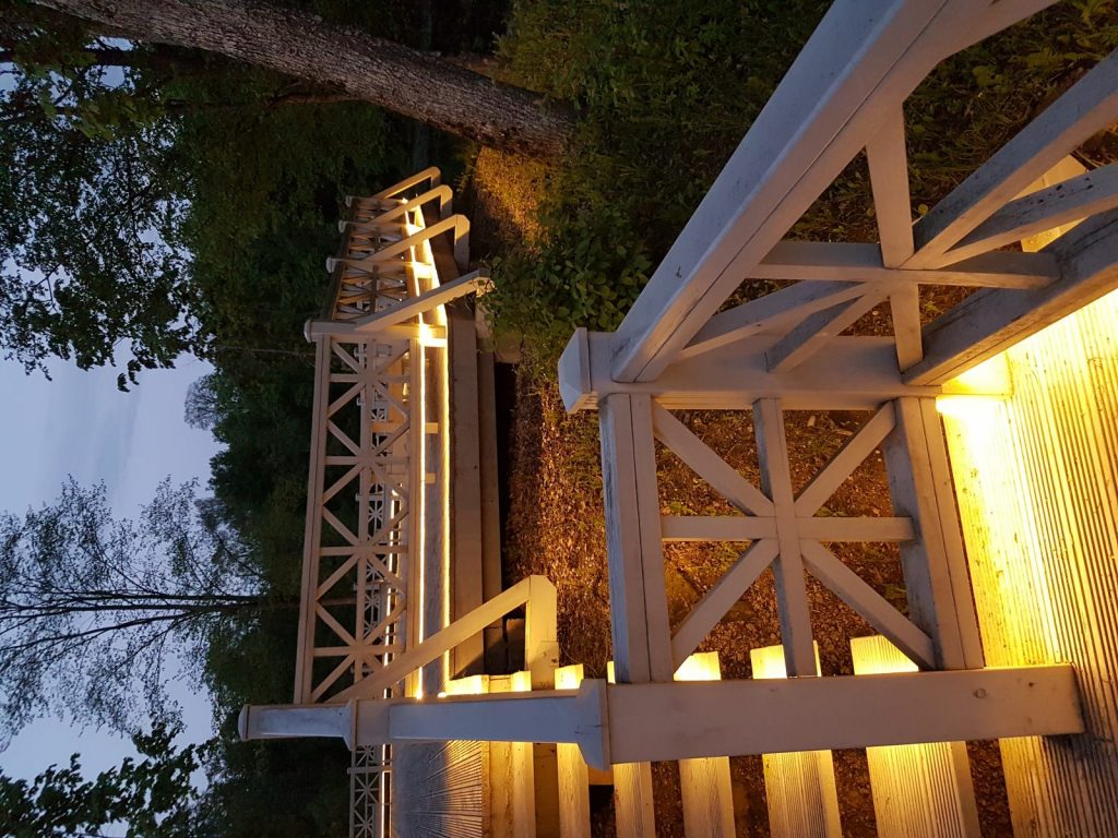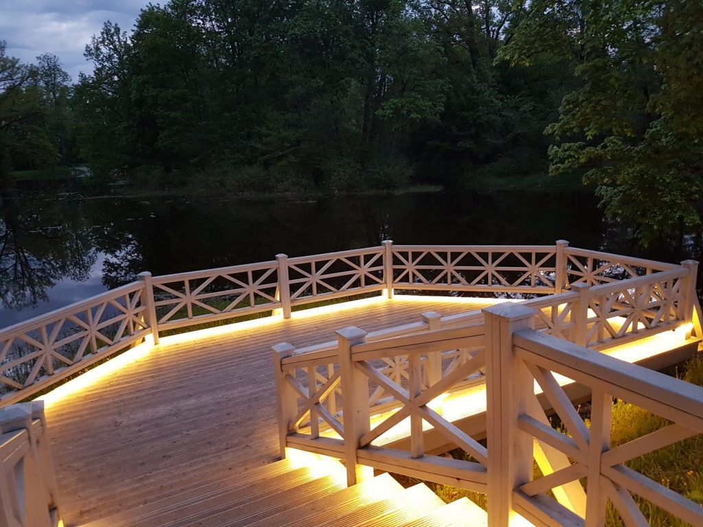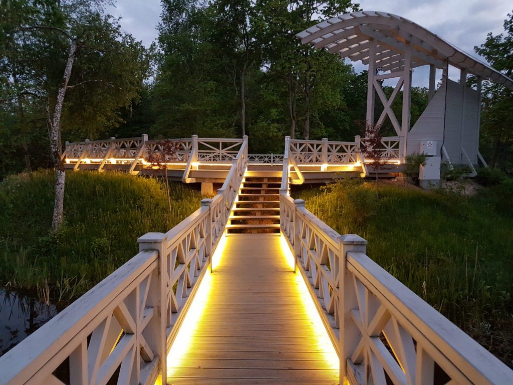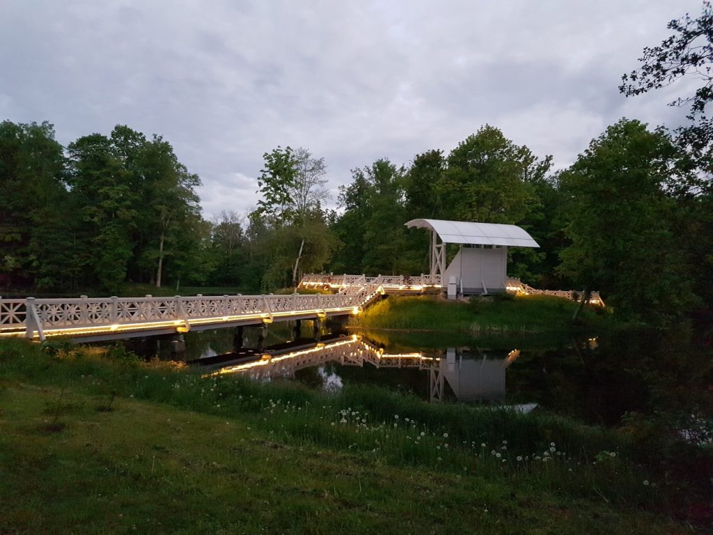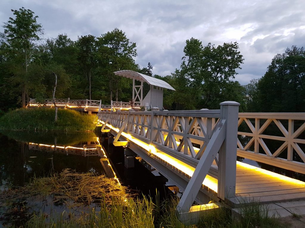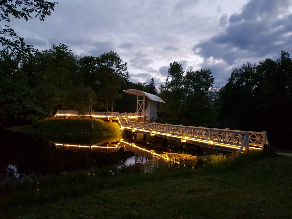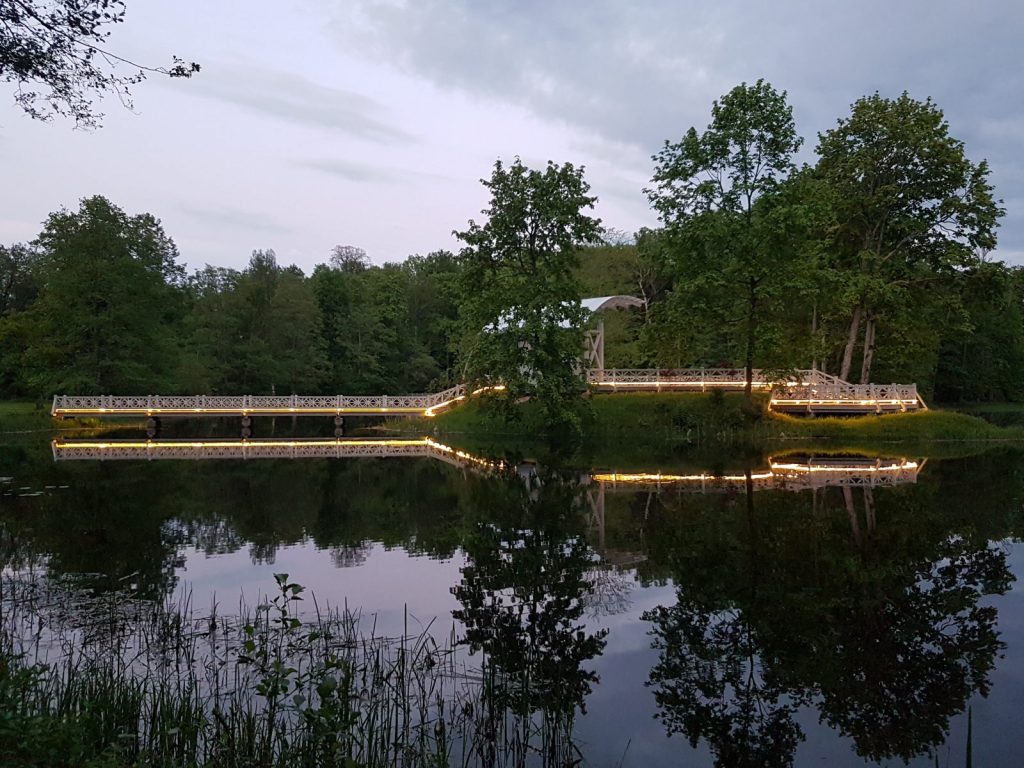 Izgaismota Preiļu parka Ādama un Ievas saliņa