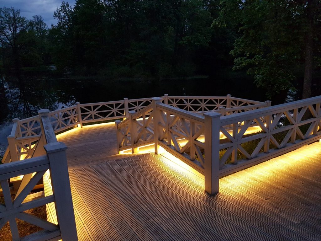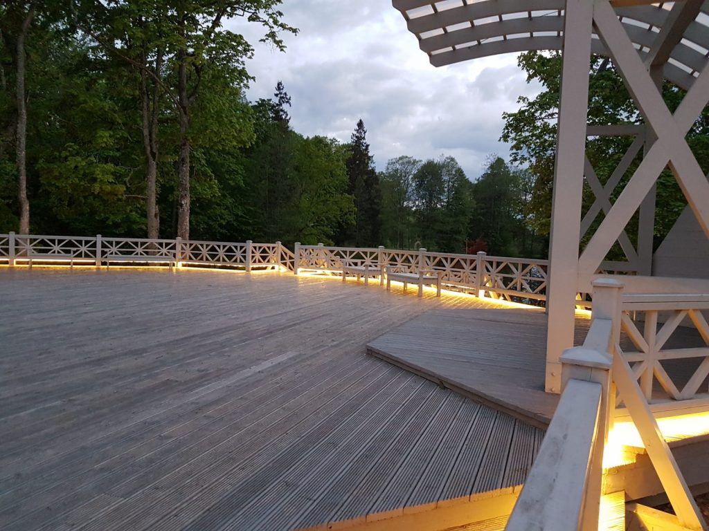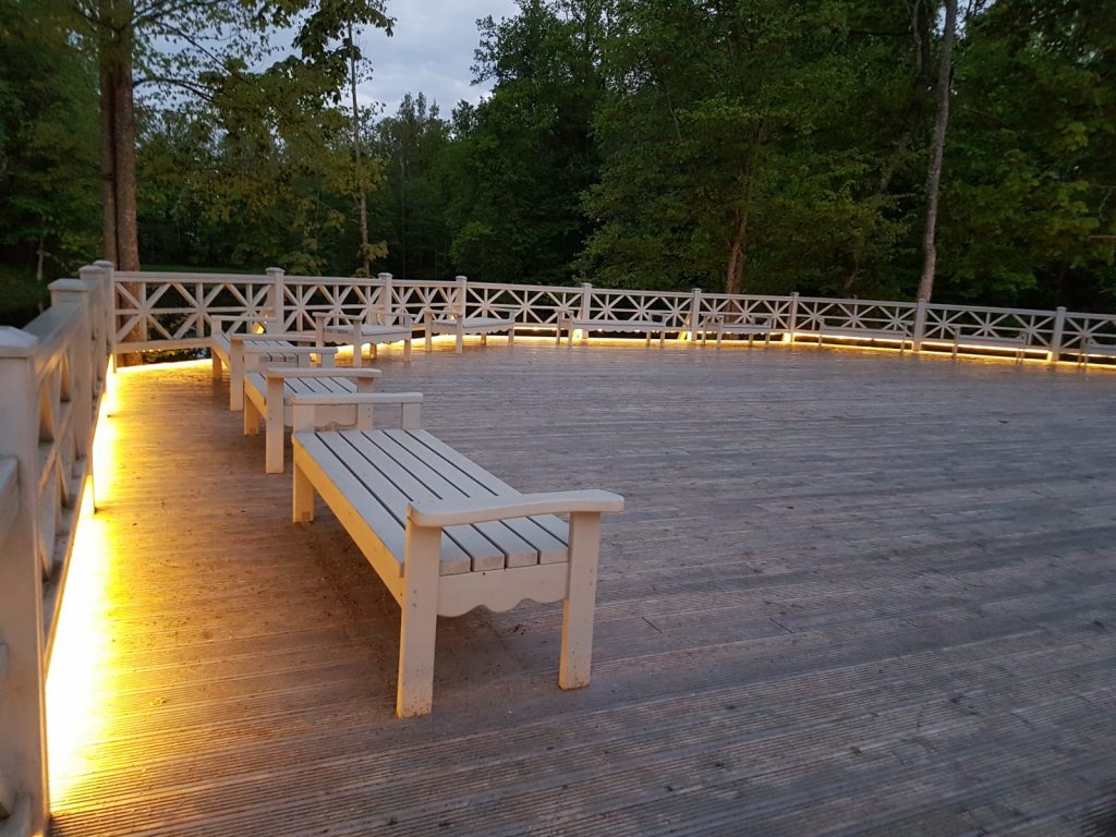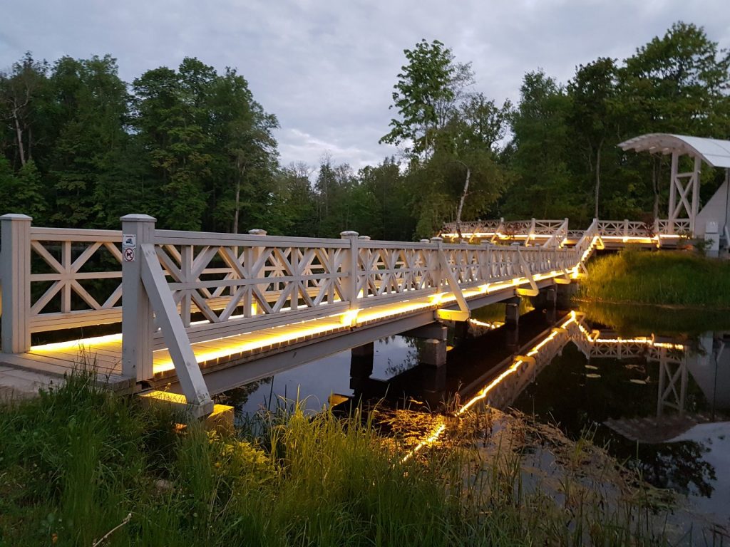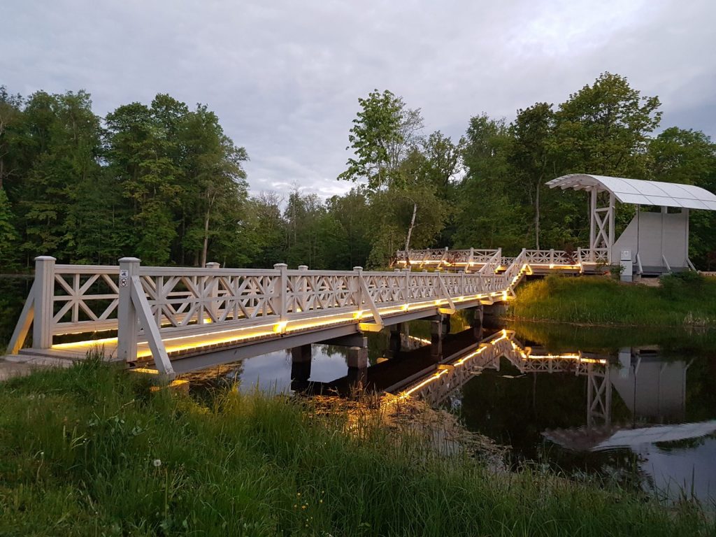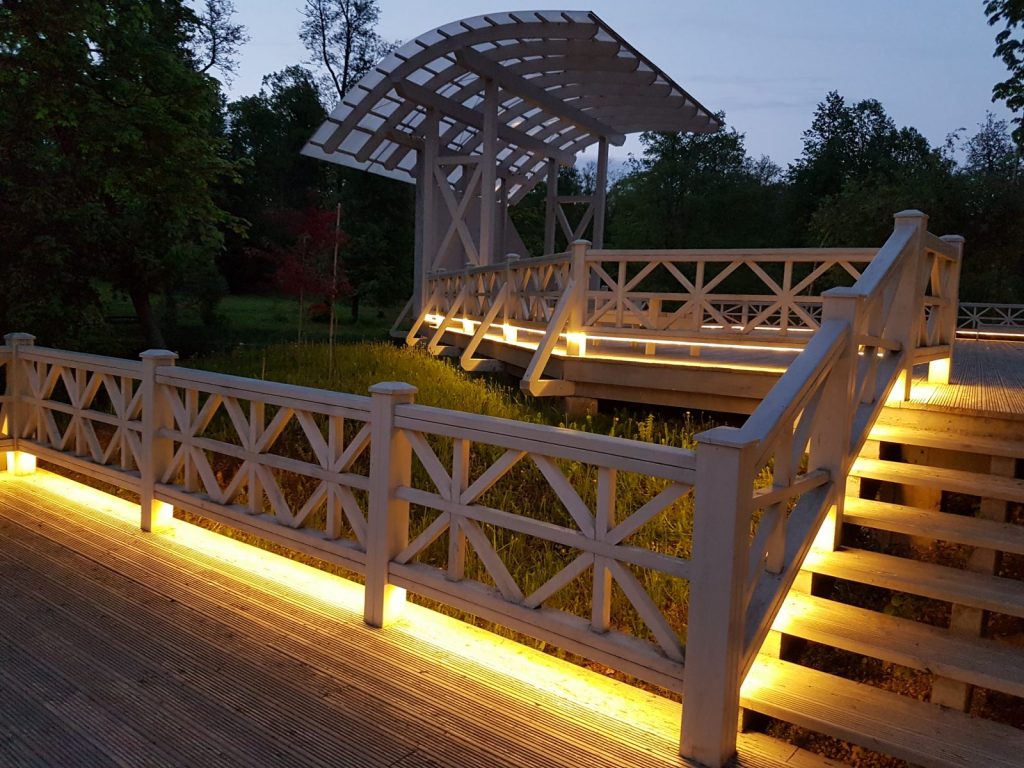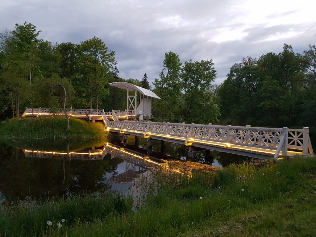 Izgaismota Preiļu parka Ādama un Ievas saliņa