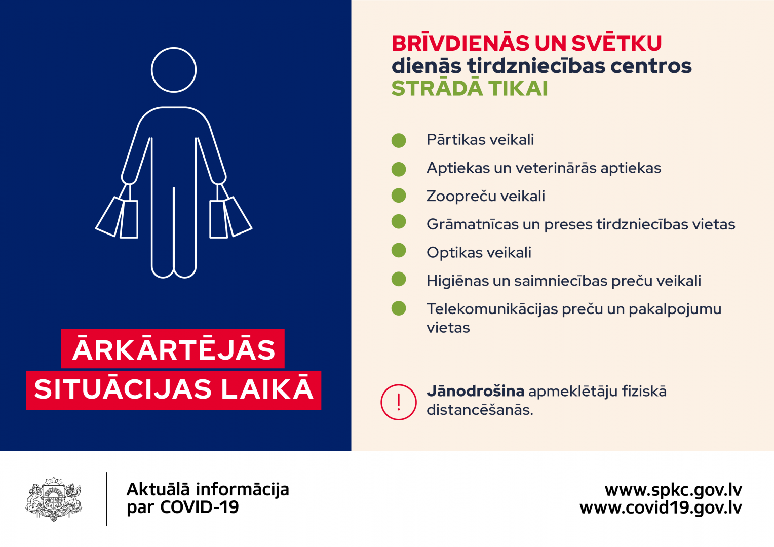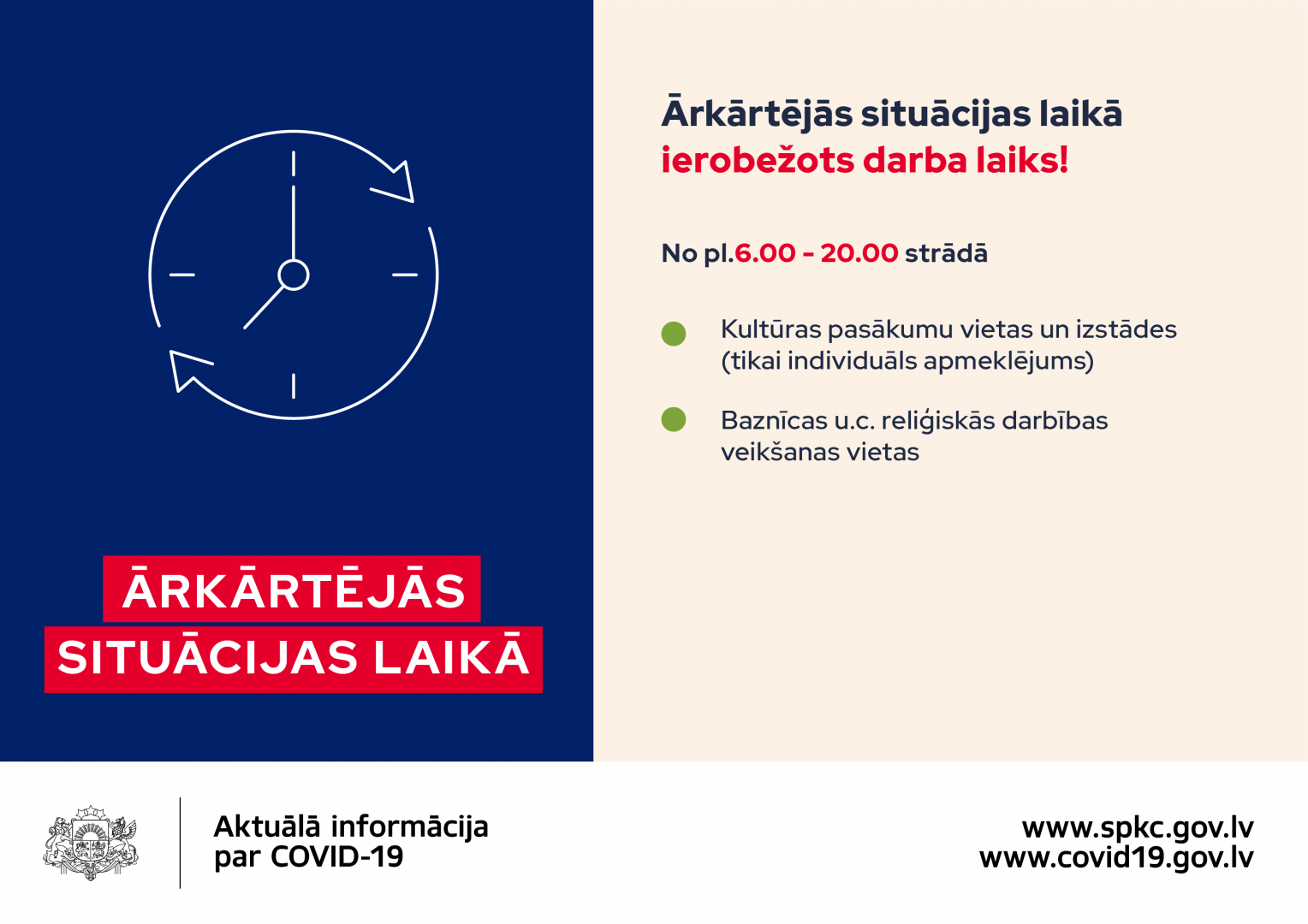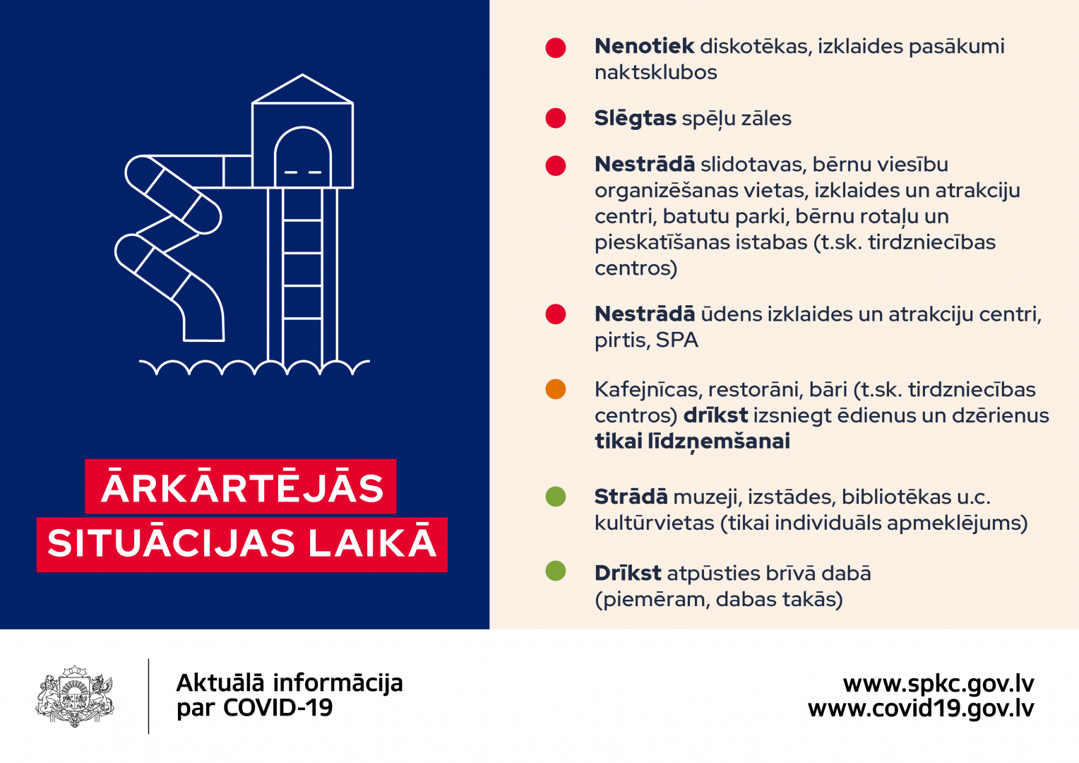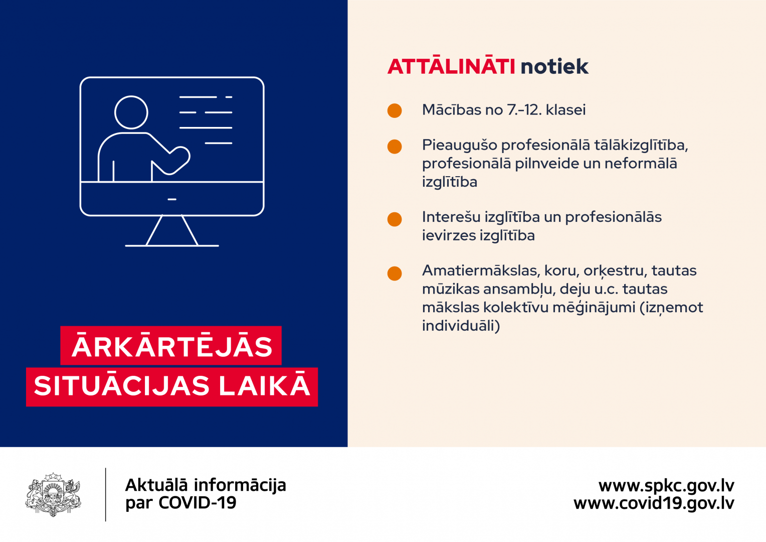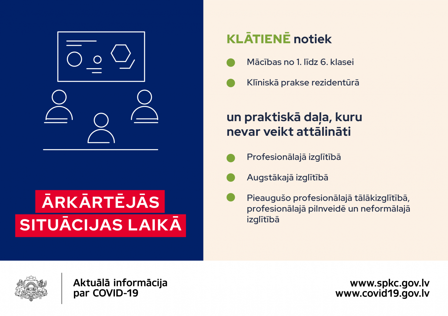 Ņemot vērā valdības lēmumu, ka no 9. novembra līdz 6. decembrim valstī būs izsludināta ārkārtējā situācija*, Veselības ministrija uzsver, ka šajā laikā būtiski ir atjaunot prasmes sadzīvot ar Covid-19 tā, lai izdotos ierobežot Covid-19 izplatību, stabilizētu situāciju un būtu iespējams atgriezties ierastajā dzīvē.