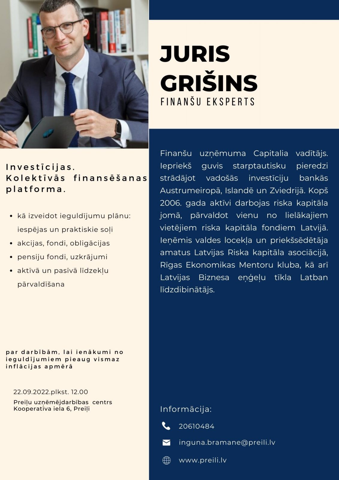 Semināru vadīs Juris Grišins, finanšu eksperts: Finanšu uzņēmuma “Capitalia” vadītājs. Iepriekš guvis starptautisku pieredzi strādājot vadošās investīciju bankās Austrumeiropā, Islandē un Zviedrijā. Kopš 2006. gada aktīvi darbojas riska kapitāla jomā, pārvaldot vienu no lielākajiem vietējiem riska kapitāla fondiem Latvijā. Ieņēmis valdes locekļa un priekšsēdētāja amatus “Latvijas Riska kapitāla asociācijā”, “Rīgas Ekonomikas Mentoru kluba”, kā arī Latvijas Biznesa eņģeļu tīkla “Latban” līdzdibinātājs.