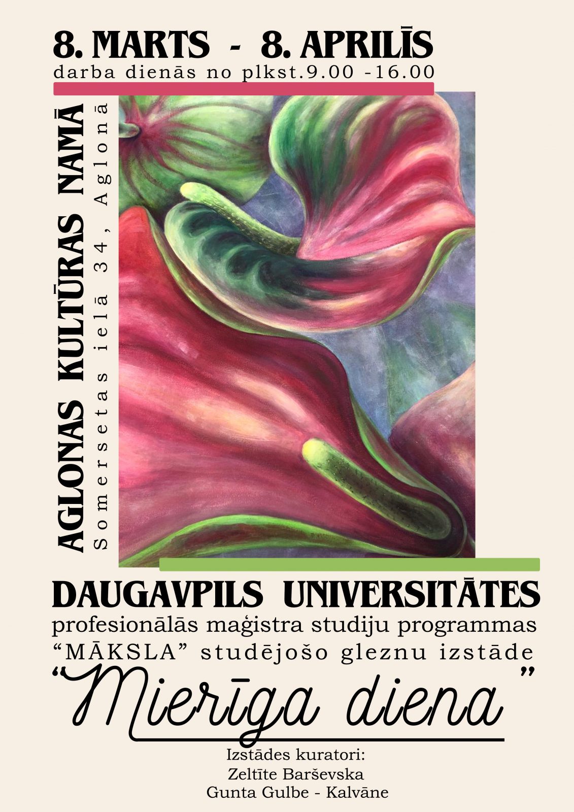 Š.g. 8. martā Aglonas kultūras namā (Somersetas iela 34, Aglona) tiks atklāta Daugavpils Universitātes Mūzikas un mākslu fakultātes profesionālās maģistra studiju programmas (PMSP) Māksla studējošo gleznu izstāde Mierīga diena.
