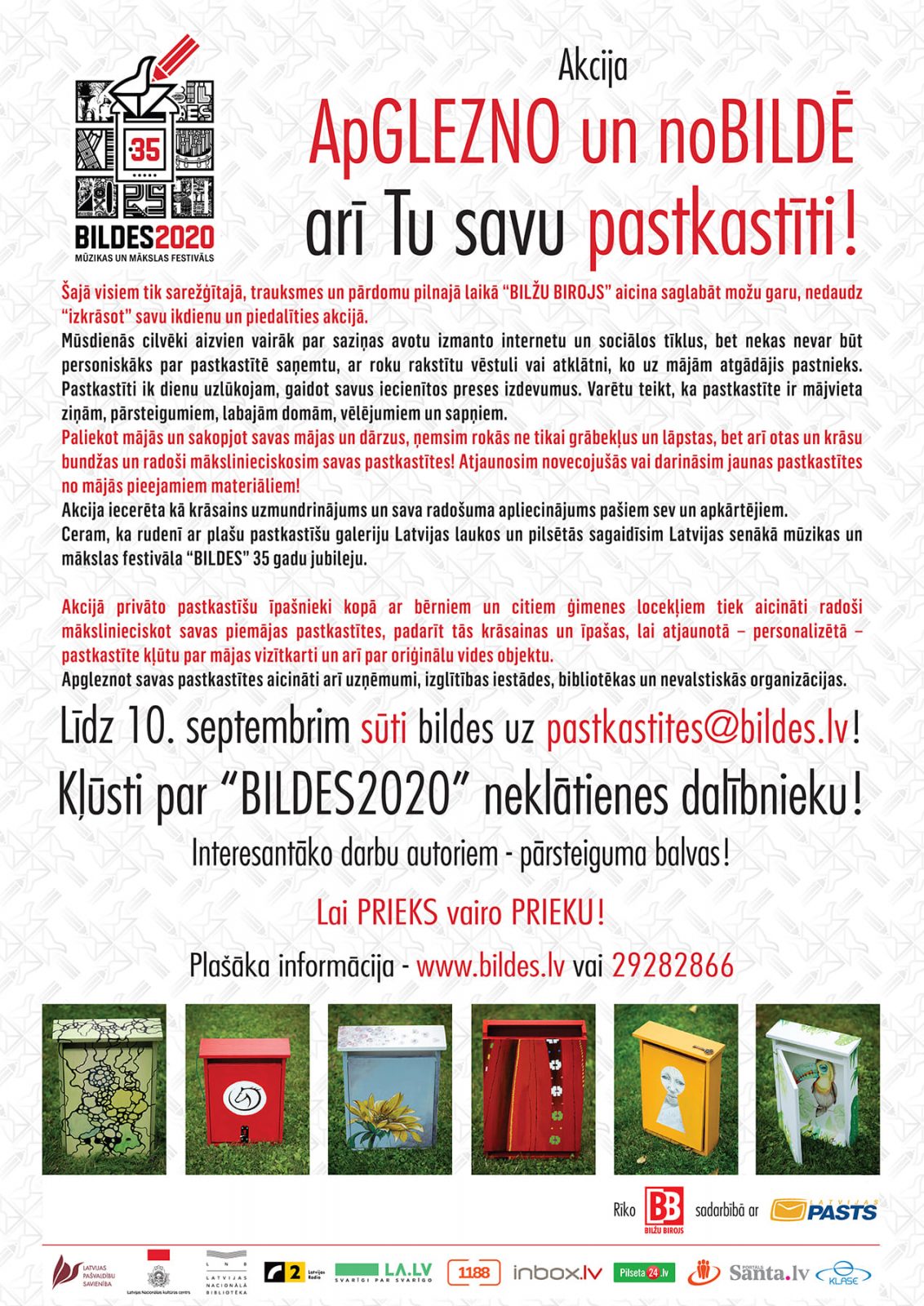 Šajā visiem tik sarežģītajā, trauksmes un pārdomu pilnajā laikā “BILŽU BIROJS” aicina saglabāt možu garu, nedaudz “izkrāsot” savu ikdienu, piedaloties akcijā “ApGLEZNO un noBILDĒ arī Tu savu pastkastīti!” un kļūstot par mūzikas un mākslas festivāla “BILDES 2020” neklātienes dalībnieku.