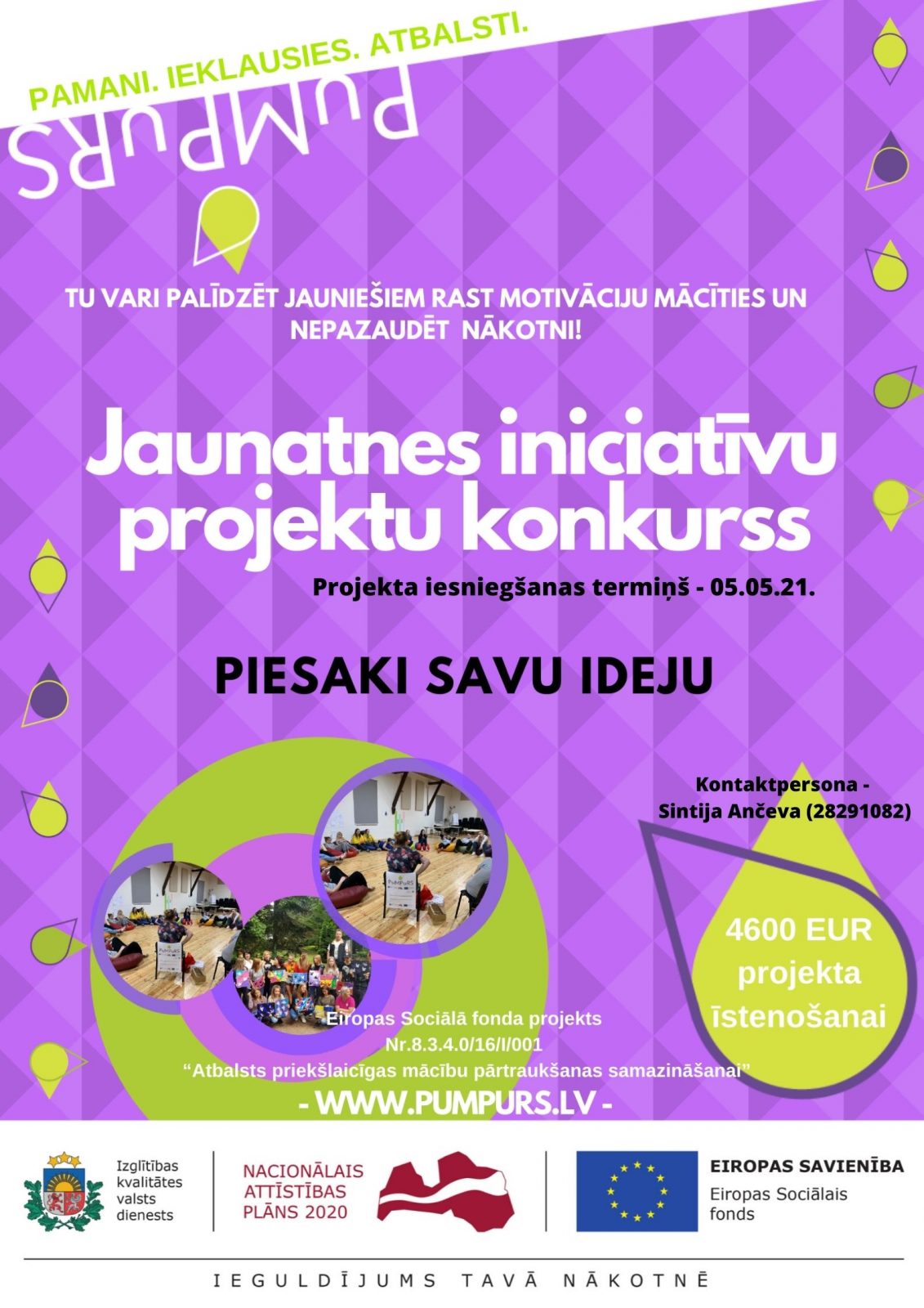 Projektu konkursu īsteno Izglītības kvalitātes valsts dienests sadarbībā ar pašvaldībām un valsts profesionālās izglītības iestādēm Eiropas Sociālā fonda projekta “PuMPuRS” ietvaros.