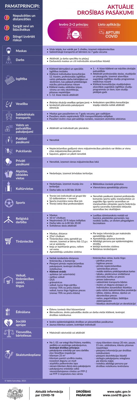 Valsts kanceleja sadarbībā ar nozaru ministrijām ir sagatavojusi vizuālu apkopojumu par aktuālajiem drošības pasākumiem Covid-19 ierobežošanai.