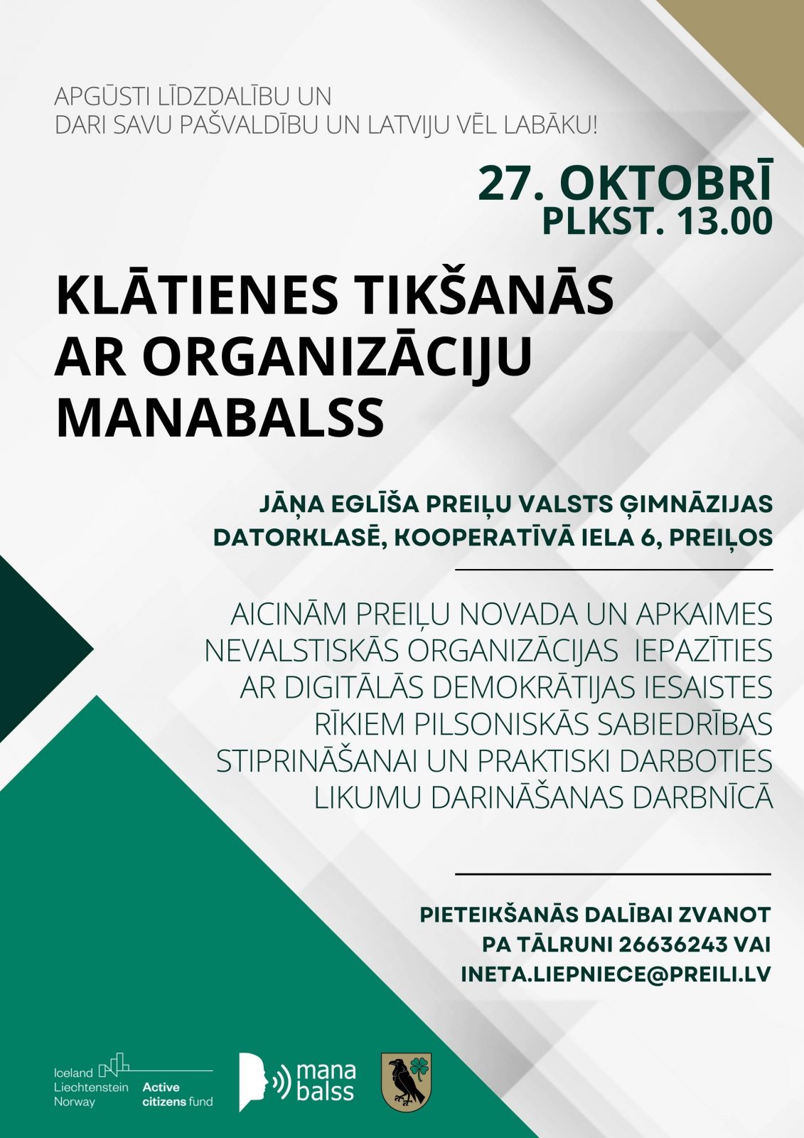 27. oktobrī plkst. 13.00 Jāņa Eglīša Preiļu Valsts ģimnāzijas datorklasē, Kooperatīvā iela 6, Preiļu novada un apkaimes nevalstiskās organizācijas aicinātas uz klātienes tikšanos ar organizāciju ManaBalss. Pasākumā būs iespēja iepazīties ar digitālās demokrātijas iesaistes rīkiem pilsoniskās sabiedrības stiprināšanai un praktiski darboties likumu darināšanas darbnīcā. Tiks prezentēta iniciatīvu vietne manabalss.lv, balsošanas un aptauju rīks lemejs.lv, platforma open2vote.eu un likumu koprakstīšanas platforma opensaeima.lv.