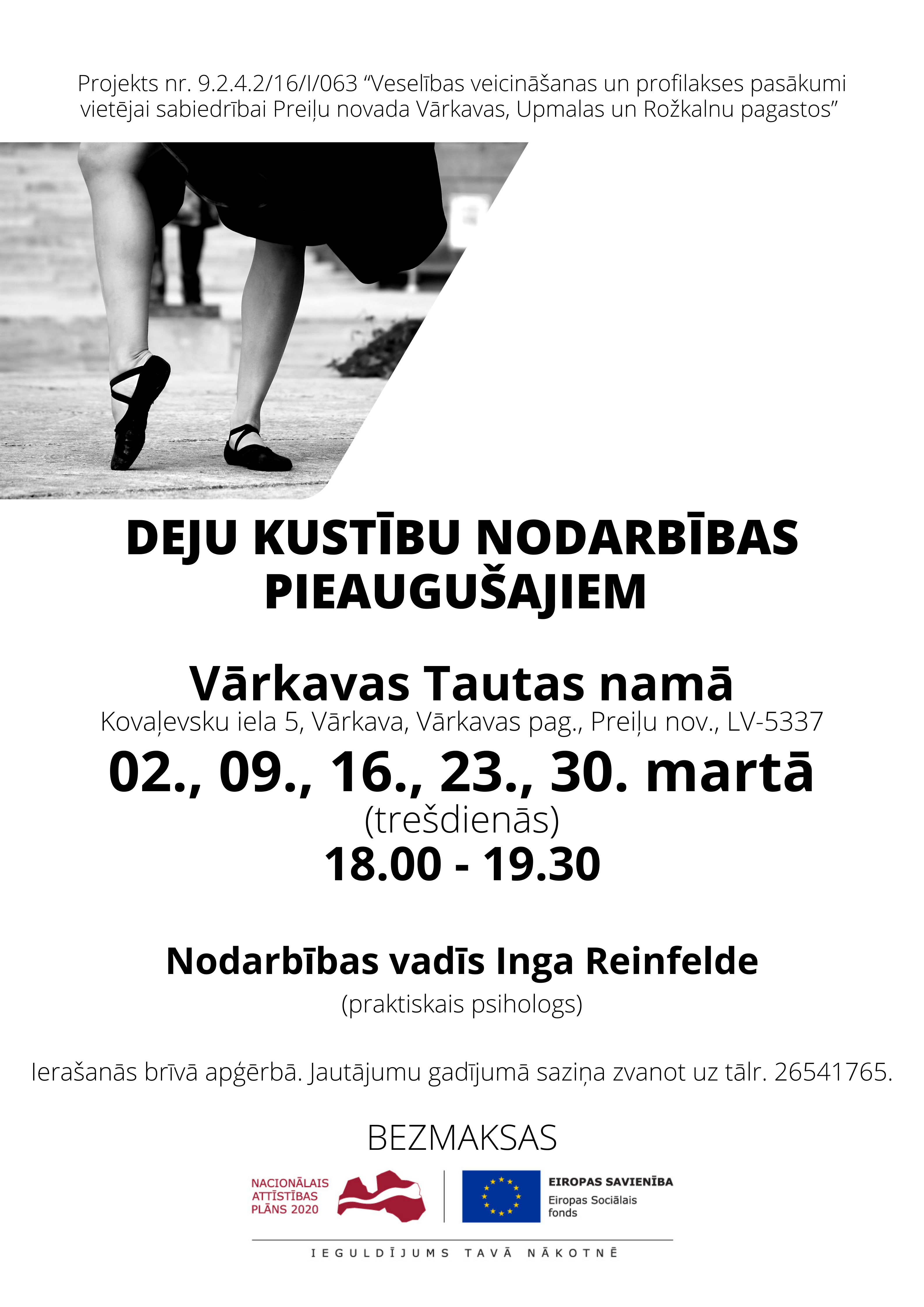 Ikviens interesents aicināts izmantot iespēju bez maksas piedalīties deju kustību nodarbībās, kas ir viena no projekta nr. 9.2.4.2/16/I/063 “Veselības veicināšanas un profilakses pasākumi vietējai sabiedrībai Preiļu novada Vārkavas, Upmalas un Rožkalnu pagastos” aktivitātēm.