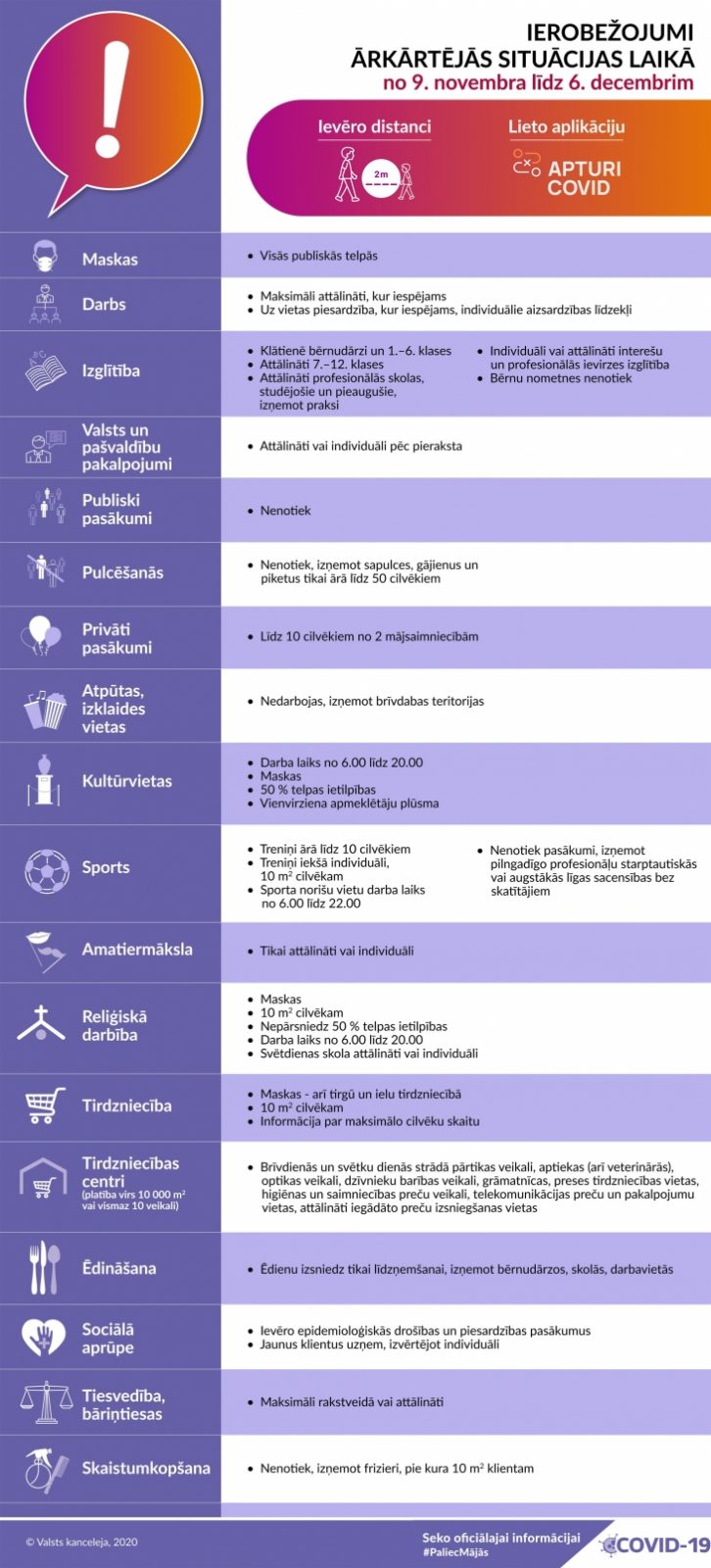 Valsts kanceleja sadarbībā ar nozares ministrijām ir sagatavojusi īsu vizuālu apkopojumu par ierobežojumiem, kas ir aktuāli ārkārtējās situācijas laikā no 9. novembra līdz 6. decembrim. Aicinām tos ievērot!