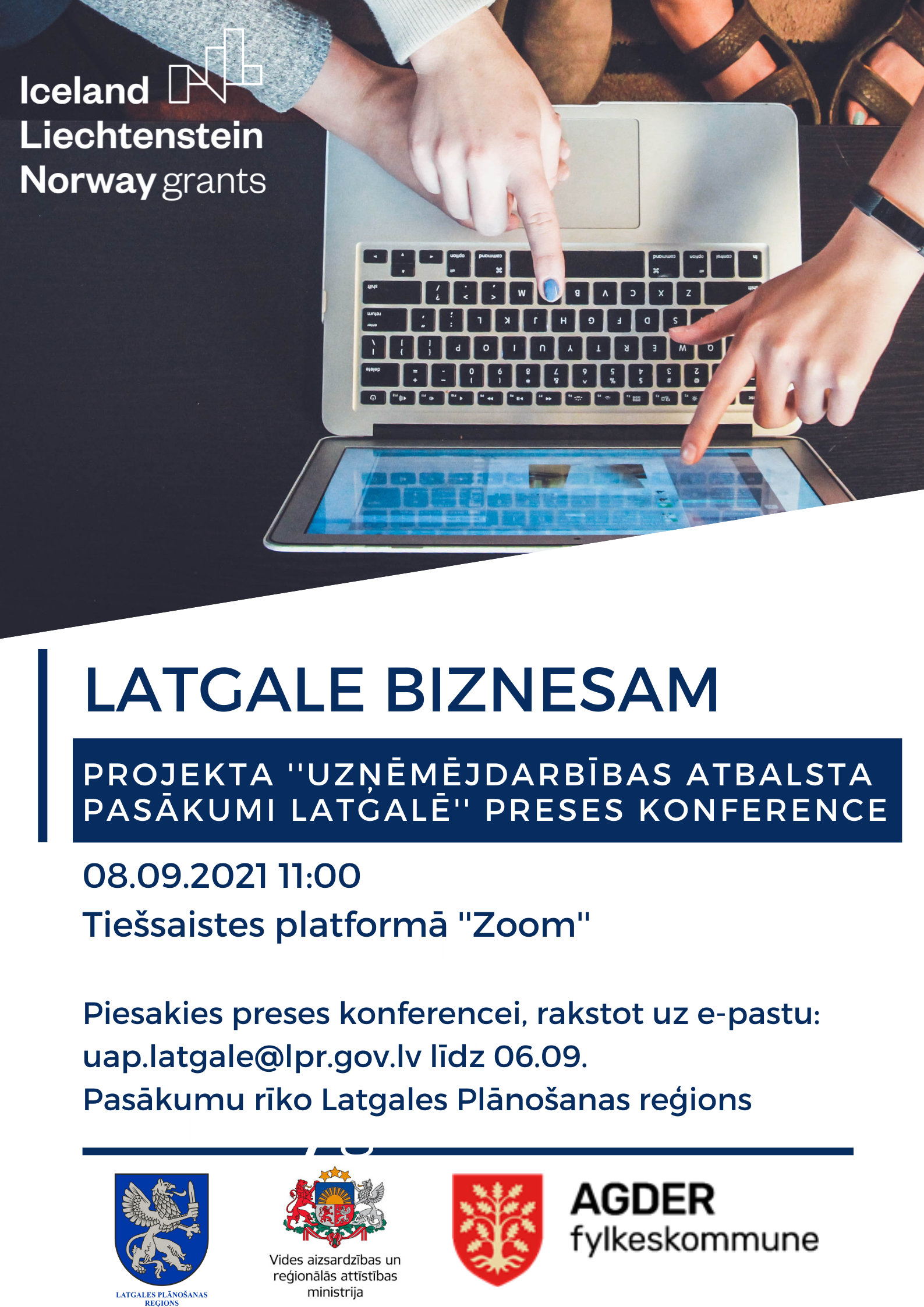 Latgales Plānošanas reģions (LPR) aicina jūs piedalīties Eiropas Ekonomikas zonas finanšu instrumenta 2014.-2021.gada perioda programmas “Vietējā attīstība, nabadzības mazināšana un kultūras sadarbība” atbalstītā projekta ”Uzņēmējdarbības atbalsta pasākumi Latgales Plānošanas reģionā” ietvaros rīkotajā preses konferencē šī gada 8.septembrī plkst. 11.00 tiešsaistes platformā ”Zoom”.