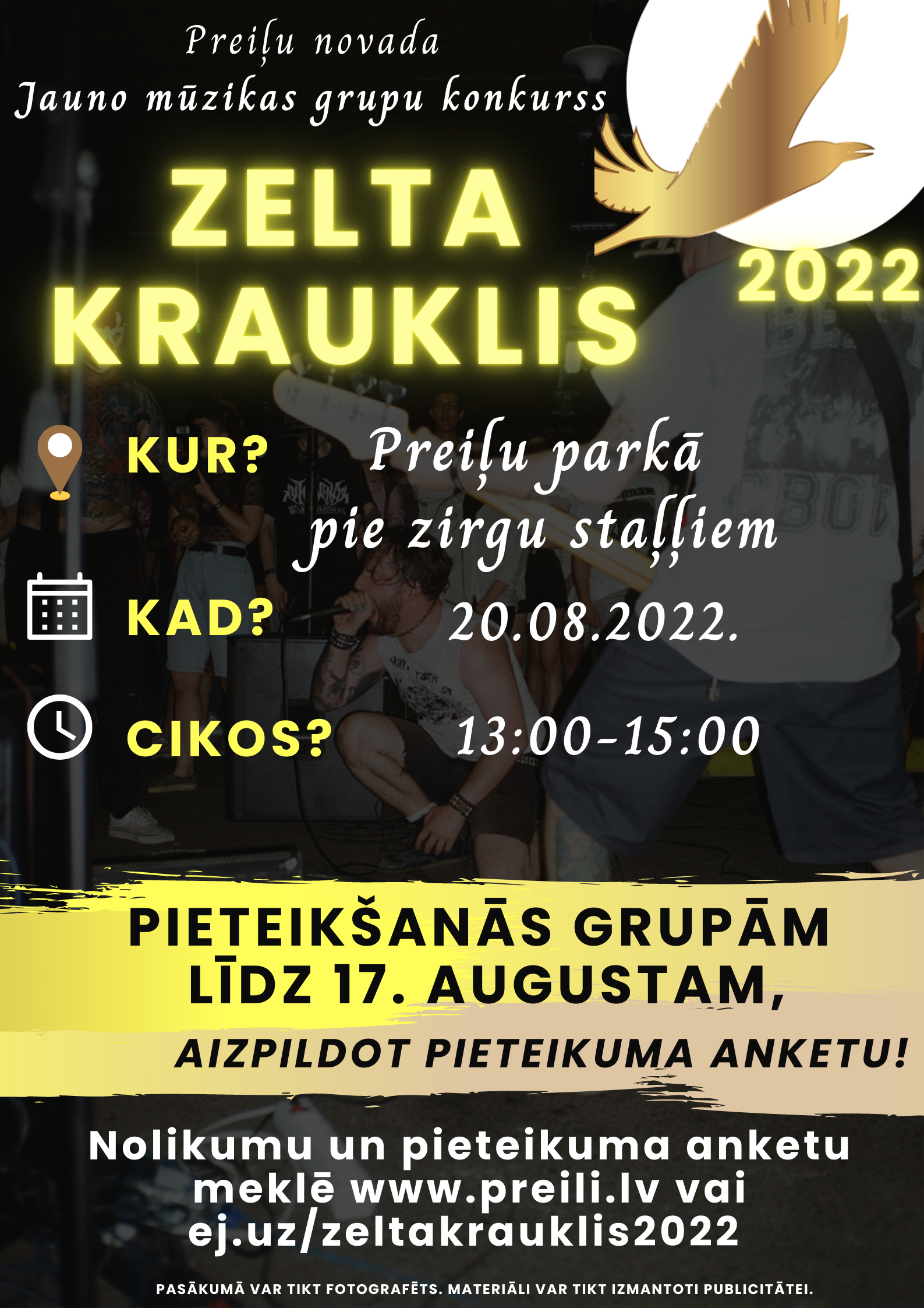 Līdz šī gada 17. augustam Riebiņu MJIC “Pakāpieni”, Preiļu JC “Četri” sadarbībā ar Preiļu novada Kultūras un tūrisma pārvaldi, Preiļu novada pašvaldību aicina jaunās mūzikas grupas no Preiļu un citiem novadiem pieteikties dalībai konkursā “Zelta Krauklis 2022”, kas šogad notiks Preiļu novada svētku ietvaros 20. augustā plkst. 13:00 Preiļu parkā pie muižas zirgu staļļiem!