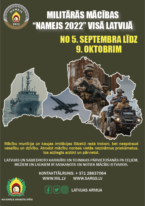 No 5. septembra līdz 9. oktobrim Latvijā norisināsies militāro mācību cikla “Namejs 2022” rudens posms, lai pārbaudītu un pilnveidotu vienību gatavību izvērsties valsts aizsardzības uzdevumu izpildei gan patstāvīgi, gan arī kolektīvās aizsardzības sistēmas ietvaros.