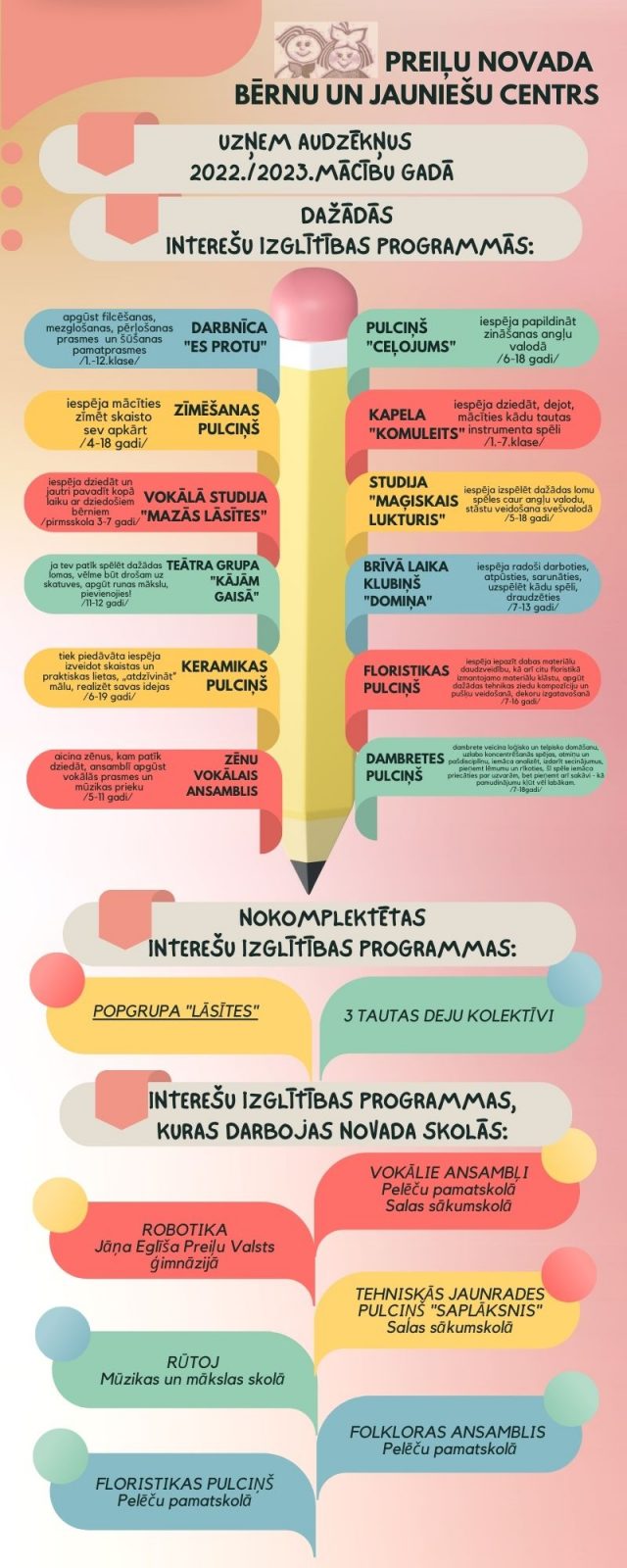 Atvērto durvju dienas “Iepazīsti Preiļu novada bērnu un jauniešu centru” notiks no 2. līdz 9. septembrim plkst. 13.00 – 17.00. Tā būs lieliska iespēja izmēģināt dažādas brīvā laika nodarbes, apgūt jaunas prasmes un izvēlēties sev piemērotāko. (Plašāka informācija sekos.)