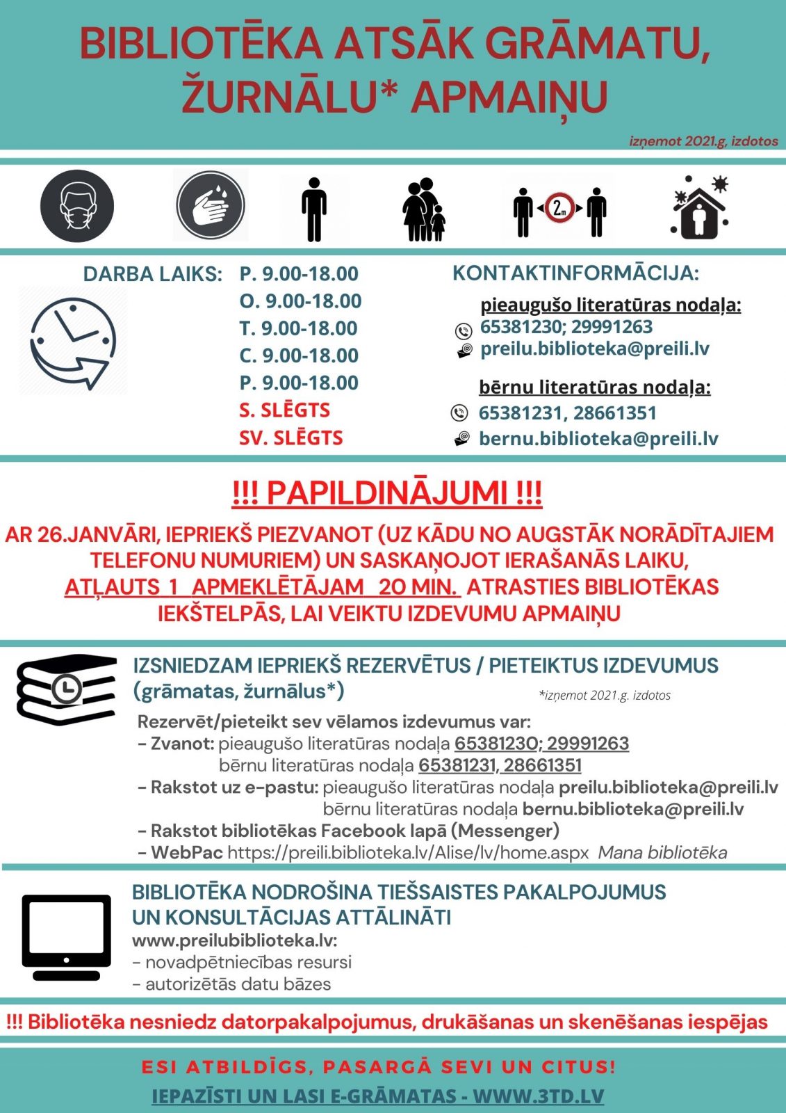 Iepriekš piezvanot un saskaņojot ierašanās laiku, atļauts1 apmeklētājam 20 min. atrasties bibliotēkas iekštelpās, lai veiktu izdevumu apmaiņu.