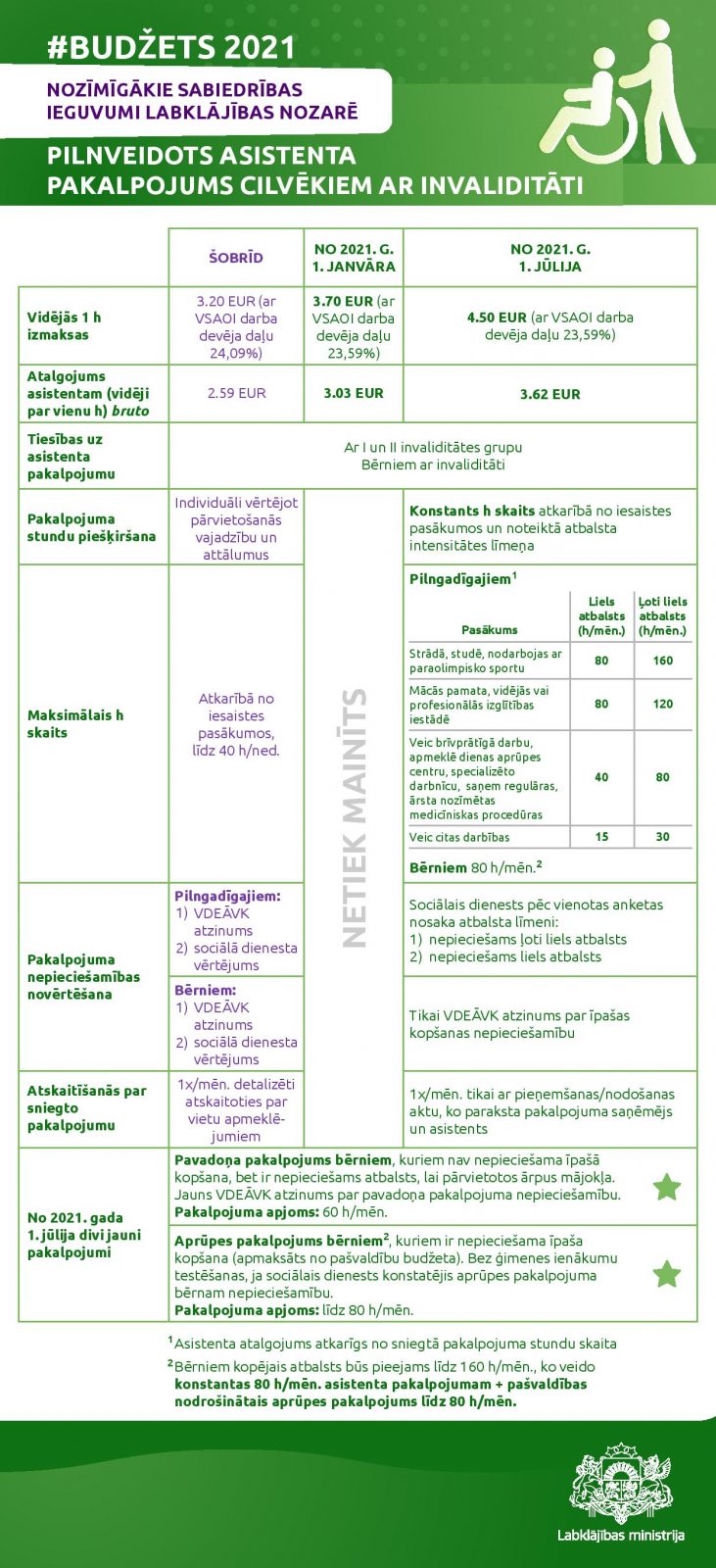 No 2021. gada 1. jūlija asistenta pakalpojuma vienas stundas izmaksas (bruto) būs 4.50 eiro līdzšinējo 3.62 eiro vietā. Tāpat būs vienkāršota atskaitīšanās kārtība par pakalpojuma sniegšanu un tiks piešķirts konstants stundu apjomu mēnesī, ko cilvēks, kas saņem asistenta pakalpojumu, tiesīgs izmantot pēc saviem ieskatiem. Tiks ieviesta arī vienota anketa pakalpojuma nepieciešamības izvērtēšanai un apjoma noteikšanas kārtība pilngadīgām personām.