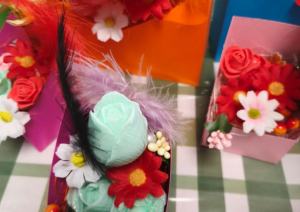 Visi skaisti saposušies un labā noskaņojumā, ar lielu interesi ķērās pie meistarklases galvenās nodarbes - smaržīgo ziepju vārīšanas. Katrs varēja izvēlēties sev tīkamākās krāsas un aromātus, radot personiskus darbiņus, kas pārtapa pavasarīgās kompozīcijās. Krāsaini ziedi, dažādi dekori un katra dalībnieka iztēle pārtapa skaistos, sirsnīgos darbos, kuros atspoguļojās pavasara vieglums un prieks.