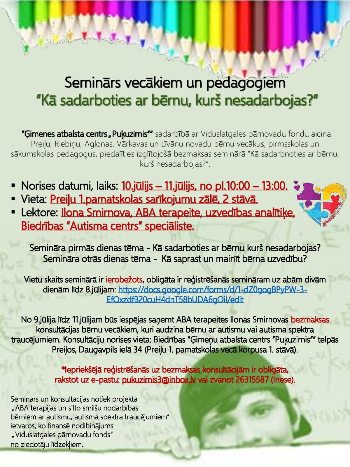 Lai informāciju par galvenajām ABA terapijas tēzēm nodotu iespējami lielākam cilvēku skaitam, gan vecāki, gan pedagogi tiek aicināti uz divu dienu semināru – 10. jūlijā tiks aplūkota tēma “Kā sadarboties ar bērnu, kurš nesadarbojas?” un 11.jūlijā tiks aplūkota tēma “Kā saprast un mainīt bērna uzvedību?”. Vietu skaits seminārā, kurš notiks Preiļu 1.pamatskolas sarīkojumu zālē no plkst. 10.00 līdz plkst. 13.00, ir ierobežots, obligāta ir reģistrēšanās semināram uz abām divām dienām līdz 8.jūlijam: www.docs.google.com/forms/d/1-dZ0gogBPyPW-3-EfOxzdfB20cuH4dnT58bUDA6gOiI/edit.