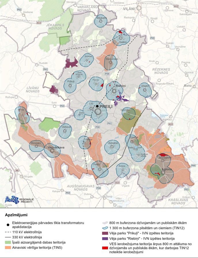 Preiļu novada teritorijas plānojumā tika noteikta buferzona 1,3 km attālumā no Preiļu pilsētas un ciemu teritoriju robežām vēja elektrostaciju izbūvei, kuru jauda ir 20 kW un vairāk. Savukārt Ministru kabineta noteikumi paredz minimālo attālumu – 800 metri no tuvākās plānotās vēja elektrostacijas un vēja parka robežas līdz dzīvojamām un publiskām ēkām. Pašvaldības VES ierobežojuma teritorija ārpus 800 m attāluma no dzīvojamām un publiskām ēkām, kur darbojas TIN 12 noteiktie aprobežojumi, sastāda tikai 460,82 ha jeb 0,33% (skat. karti).