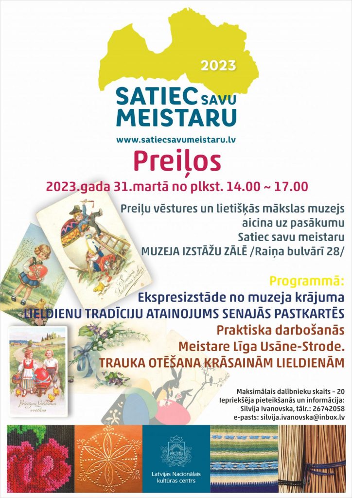 2023. gada 31. martā plkst. 14.00-17.00 Preiļu vēstures un lietišķās mākslas muzejs (Muzeja izstāžu zālē, Raiņa bulvārī 28) aicina uz pasākumu “Satiec savu meistaru”.