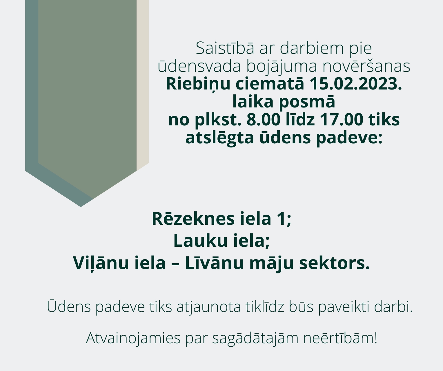 Ūdens padeve tiks atjaunota tiklīdz būs paveikti darbi. Atvainojamies par sagādātajām neērtībām!