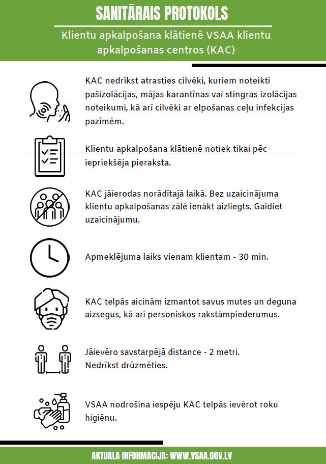 Tā kā ne visos VSAA klientu apkalpošanas centros ir pietiekami plašas uzgaidāmās telpas, klienti tiek lūgti ierasties precīzi norādītajā laikā un klientu apkalpošanas zālē ieiet tikai tad, kad tiks uzaicināti. Klientu apkalpošanas centru telpās VSAA aicina ievērot distanci, izmantot savus mutes un deguna aizsegus un personiskos rakstāmpiederumus. Riska grupas personas un apmeklētājus ar elpceļu saslimšanas pazīmēm VSAA lūdz no klātienes apmeklējuma atturēties.