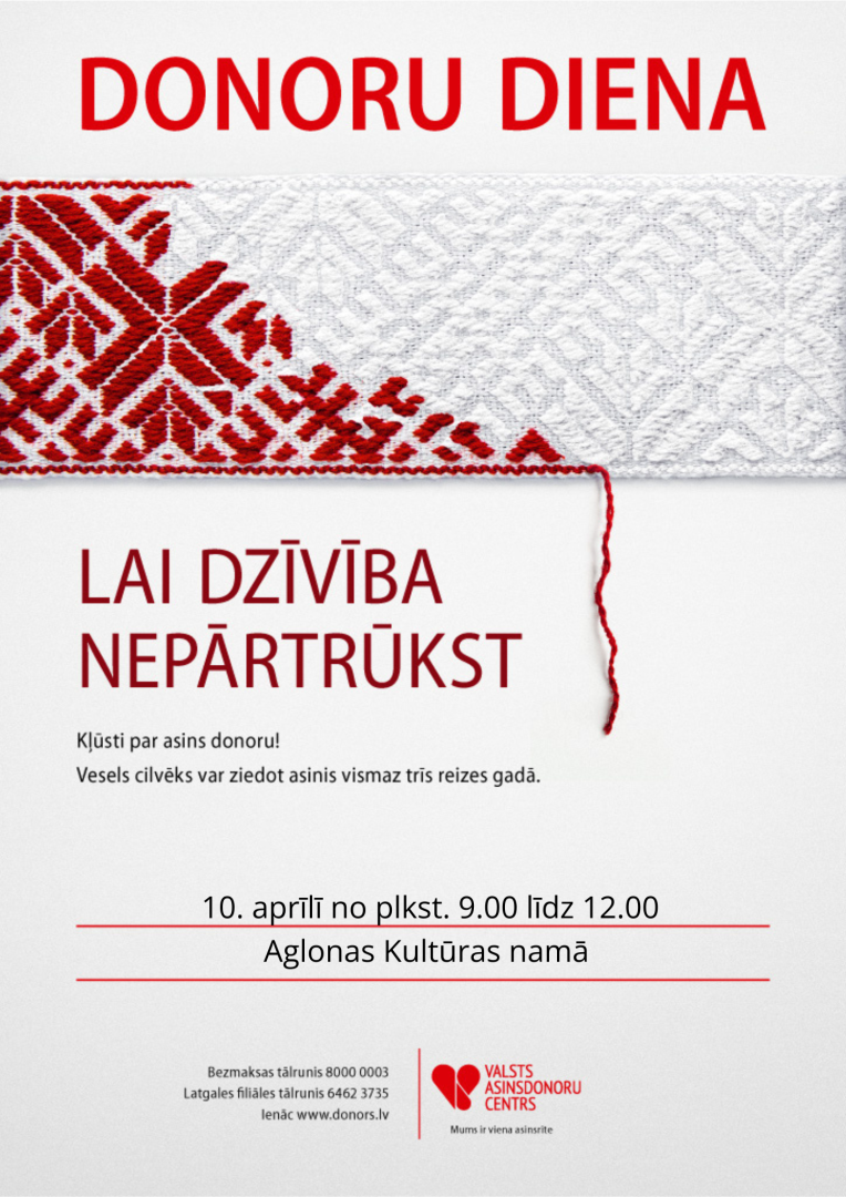 Informējam, ka 10. aprīlī no plkst. 9.00 līdz 12.00 Aglonas Kultūras namā (Somersētas iela 34, Aglona, Aglonas pagasts) norisināsies donoru diena!