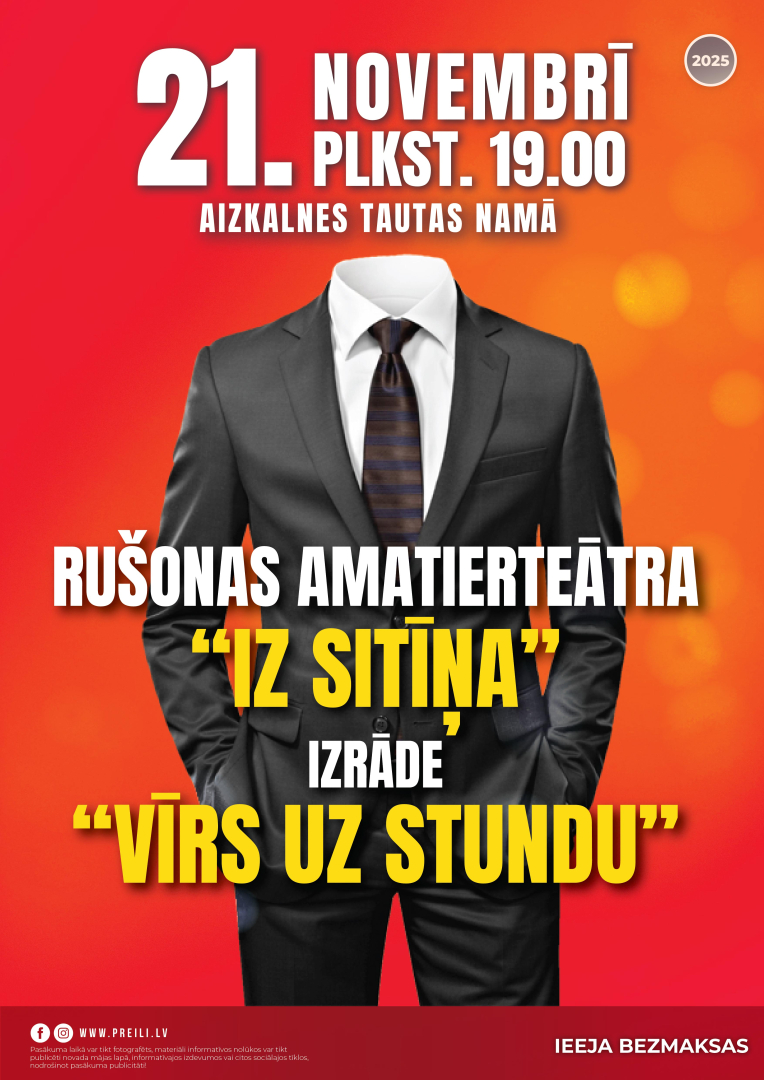 21. novembrī plkst. 19.00 Aizkalnes Tautas namā norisināsies Rušonas amatierteātra izrāde “Vīrs uz stundu”.