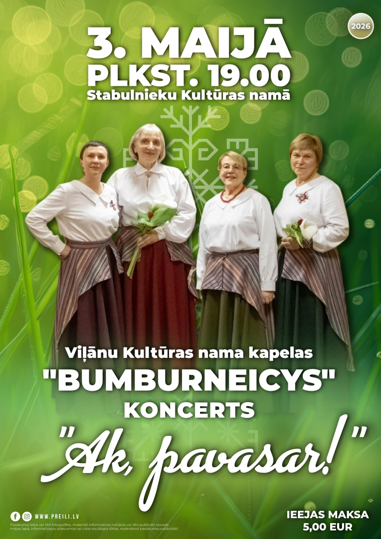 Svinot maija svētkus, Stabulnieku Kultūras nams 3. maijā plkst. 19.00 ielūdz uz jestru koncertu "Ak pavasar!", kuru sniegs Viļānu Kultūras nama kapela "Bumburneicys".